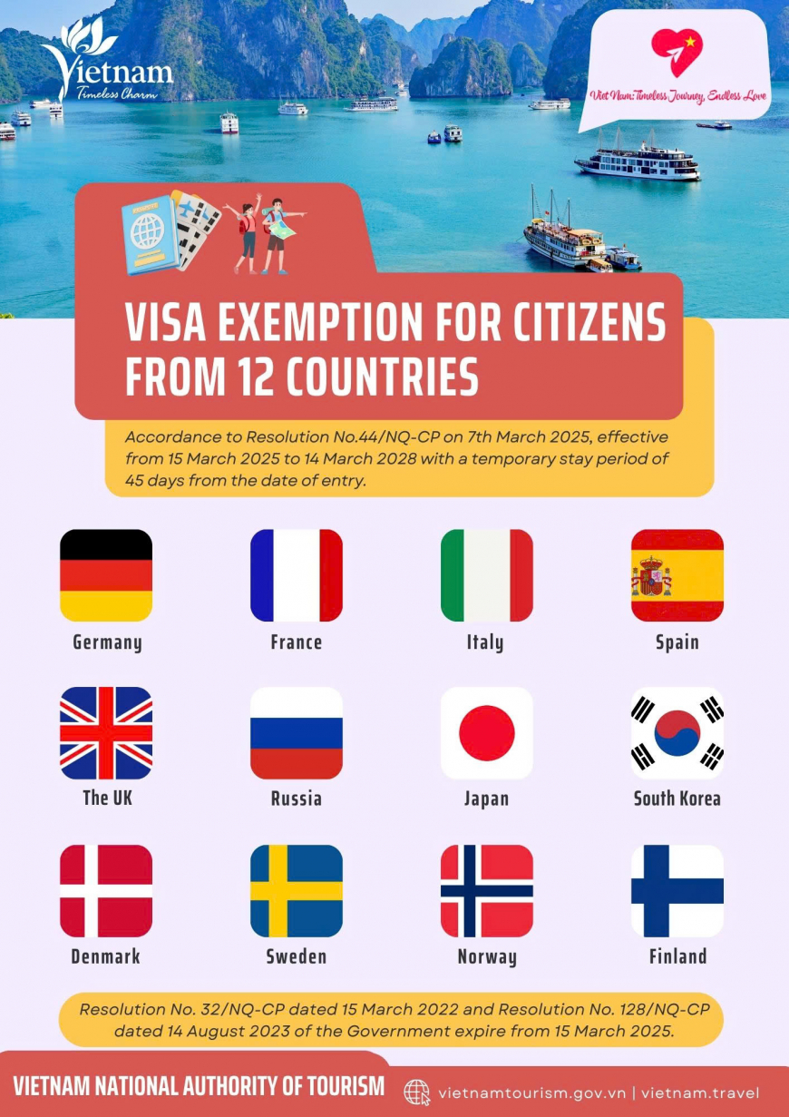 According to the Vietnamese government’s policy, citizens of the following 12 countries can enter Vietnam visa-free for up to 45 days: